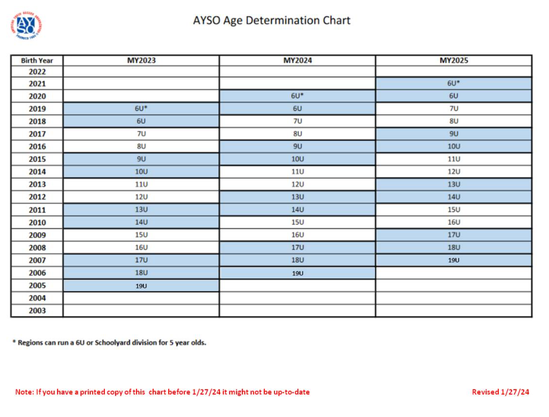 Example: For MY2025 the division the child will be placed in will be determined based on their age as of December 31, 2026. This age determination does not apply to Playground or Schoolyard division.