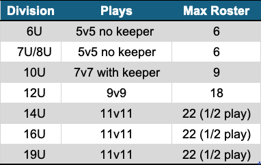 *THERE WILL BE ABSOLUTELY NO PLAYERS ALLOWED TO MOVE DOWN AN AGE GROUP DUE TO INSURANCE REASONS AND REGULATIONS, REGARDLESS OF CIRCUMSTANCE. MOVE UP REQUESTS WILL BE CONSIDERED ON A CASE BY CASE BASIS BUT WILL BE EXTREMELY RARE.